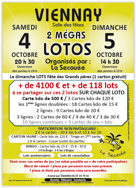 Le04oct.à 20h30 Salle des fêtes de Viennay 4 rue de Bel air 79200 ViennayAjouter à mon calendrierLoisirs2 méga lotos par la Secouée de Viennay 2 lotos : samedi 20h30dimanche 14h30ContactCultureLa Secouée Adresse : 79200 ViennayTél. : 07 80 05 20 88 Courriel Site Internet Horaires : Association théâtrale de ViennayItinéraire : Itinéraire Sélection de la vue© OpenStreetMap contributorsFermerPrécédentRetour à la listeSuivant