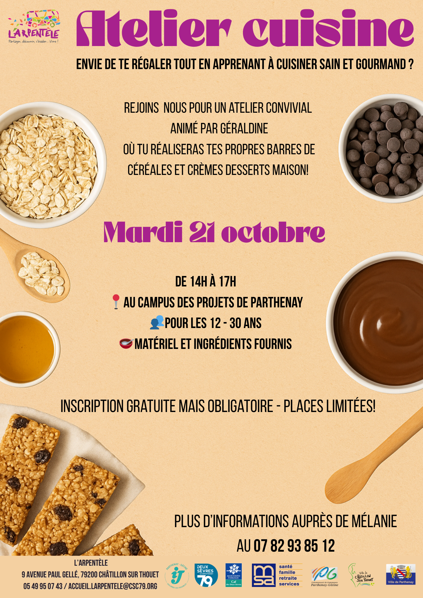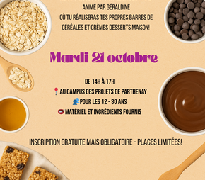Rejoins nous pour un atalier convivial animé par Géraldine où tu réaliseras tes propres barres de céréales et crèmes desserts maison !
