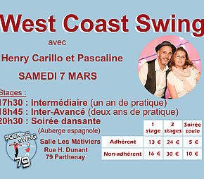 L'association Rock and Swing 79 vous propose des stages de West Coast Swing avec Henry Carillo et Pascaline suivis d'une soirée dansante avec auberge espagnole !