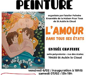 4ème exposition de peinture organisée par les peintres de la MPT de St Aubin le Cloud. Le thème cette année "l'amour dans tous ses états" : on va se régaler de bonheur, de tendresse, de joie et d'amour ! A voir sans modération !
