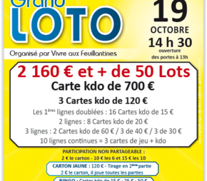 Le19oct.à 14h30 Salle socio-culturelle (grande) Avenue de la Vernière 79200 Le TalludAjouter à mon calendrierLoisirsGrand loto organisé par Vivre aux Feuillantines 2 160 euros de lotsSélection de la vue© OpenStreetMap contributorsFermerPrécédentRetour à la listeSuivant