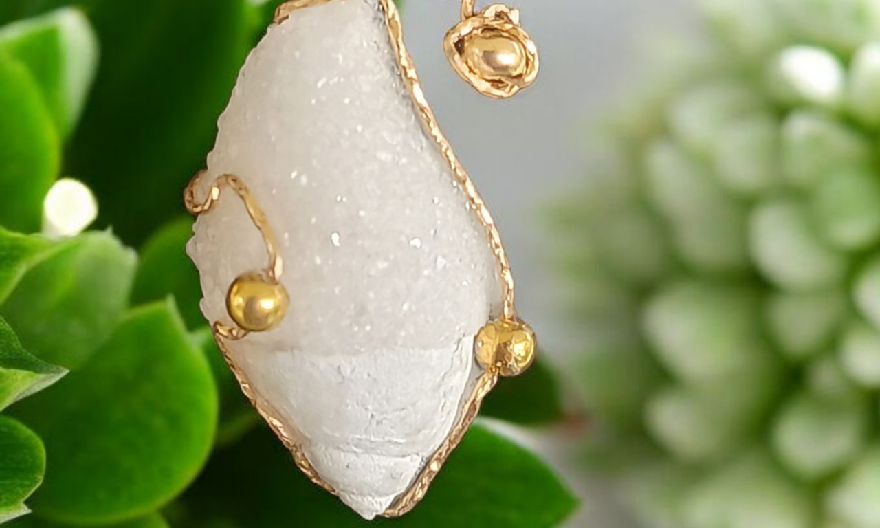 Passionnée par les blancheurs glacées des pôles, je tente de mettre en avant leurs beautés créatives. Assemblé, coulé, tordu, le verre prend alors des allures de glaces enneigées gelant en une lutte, subie par les variations météorologiques. Le verre dichroïque utilisé dans ces créations (verre coloré à l’aspect métallique) surmonté d’un cristal à facettes brutes, diffracte des couleurs chaudes ou froides selon l’orientation de la lumière.