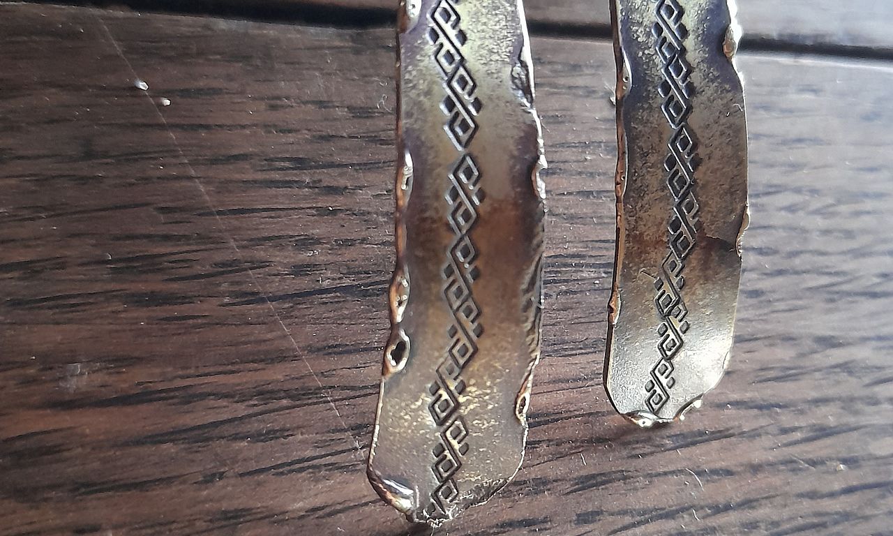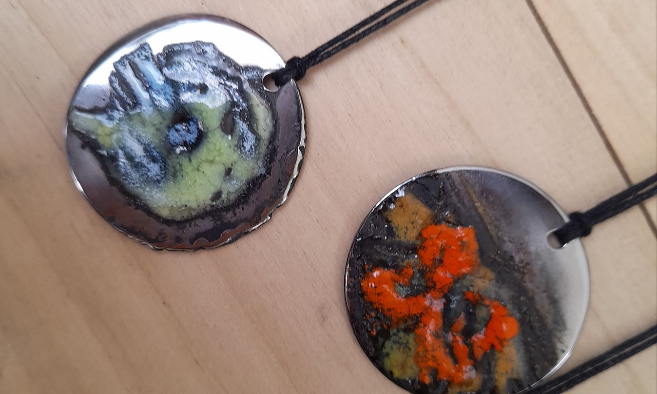 Réalisation de bijoux en métal : acier, cuivre et laiton. Un travail de marquage est réalisé sous forme de gravure, émaillage ou inclusion de métal et pierres. Le métal est d’abord chauffé pour le rendre souple et ainsi le travailler à souhait. Une fois formé le bijou peut être marqué. Enfin, vient la phase de nettoyage et lustrage du bijou pour lui donner l’aspect final désiré (brossé, poli, brillant ou patiné…).