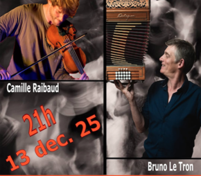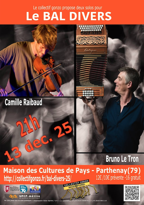 Un bal où deux esthétiques se rencontrent pour le plus grand plaisir des danseurs. Camille au répertoire du sud ouest fait sonner en cadence son violon. Bruno, avec son répertoire plus généraliste, fait sonner son accordéon de ces belles lignes mélodiques dont il a le secret. Tout deux aiment à jouer pour la danse. C’est pour cela qu’ils sont là á sonner pour la danse chacun leur tour !