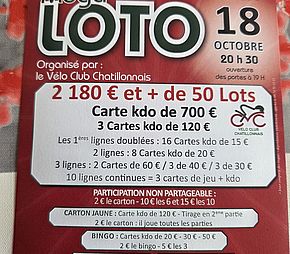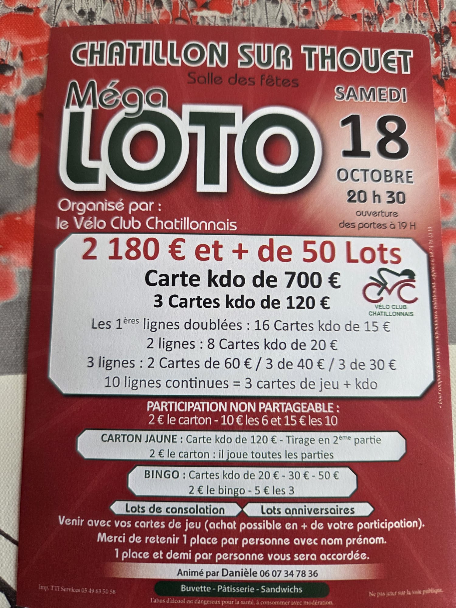 Le18oct.à 19h00 Salle des fêtes « Carpe Diem » de Châtillon-sur-Thouet 20 Avenue Sainte Anne 79200 Châtillon-sur-ThouetAjouter à mon calendrierJeuLoto du Vélo club ChâtillonaisLotoSélection de la vue© OpenStreetMap contributorsFermerPrécédentRetour à la listeSuivant