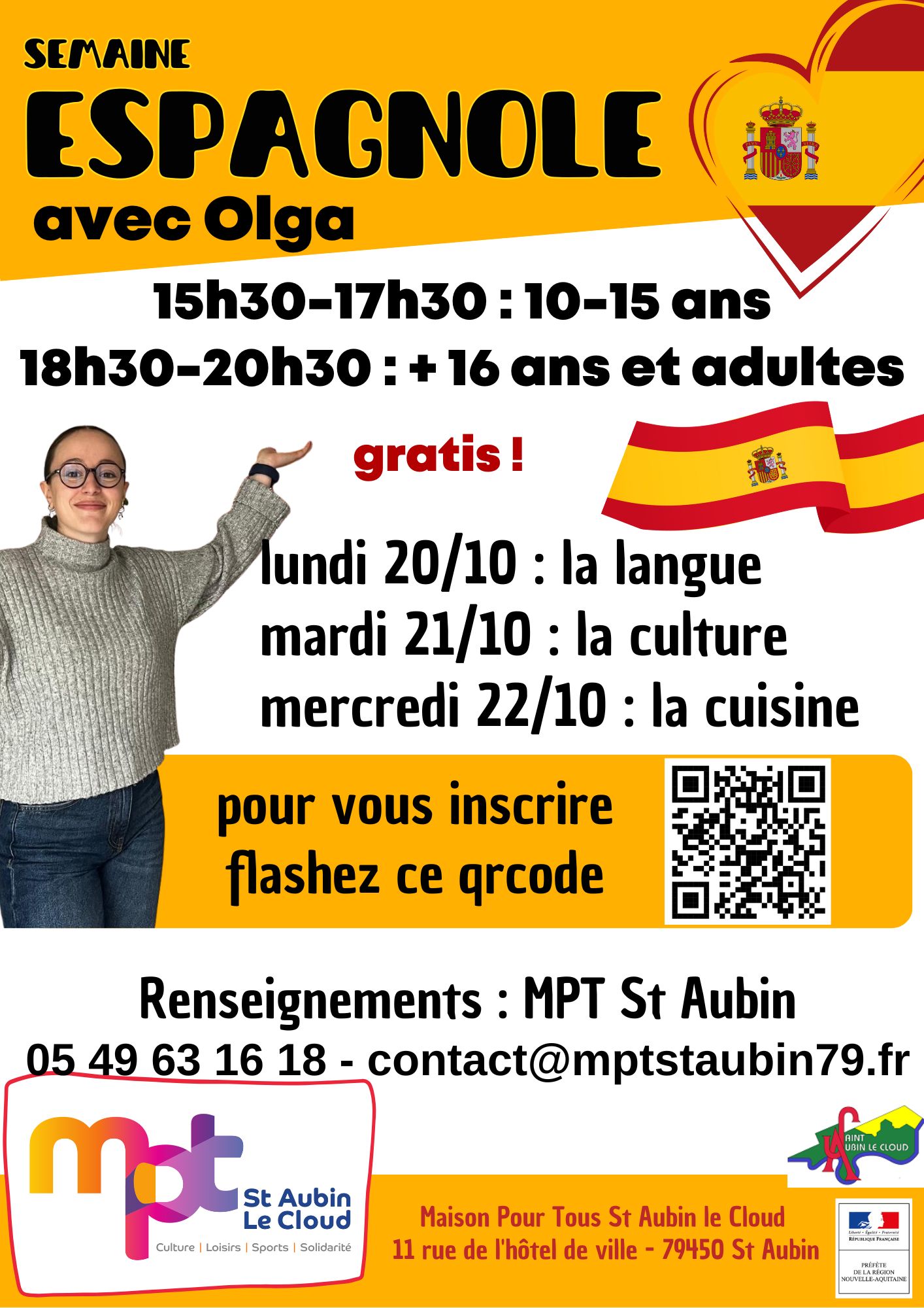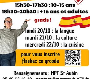 L'Espagne à portée de main ! Olga, jeune espagnole en service civique européen vous fait découvrir son pays, sa langue, sa culture et sa cuisine ! Du 20 au 22 octobre mettez-vous à l'heure espagnole !