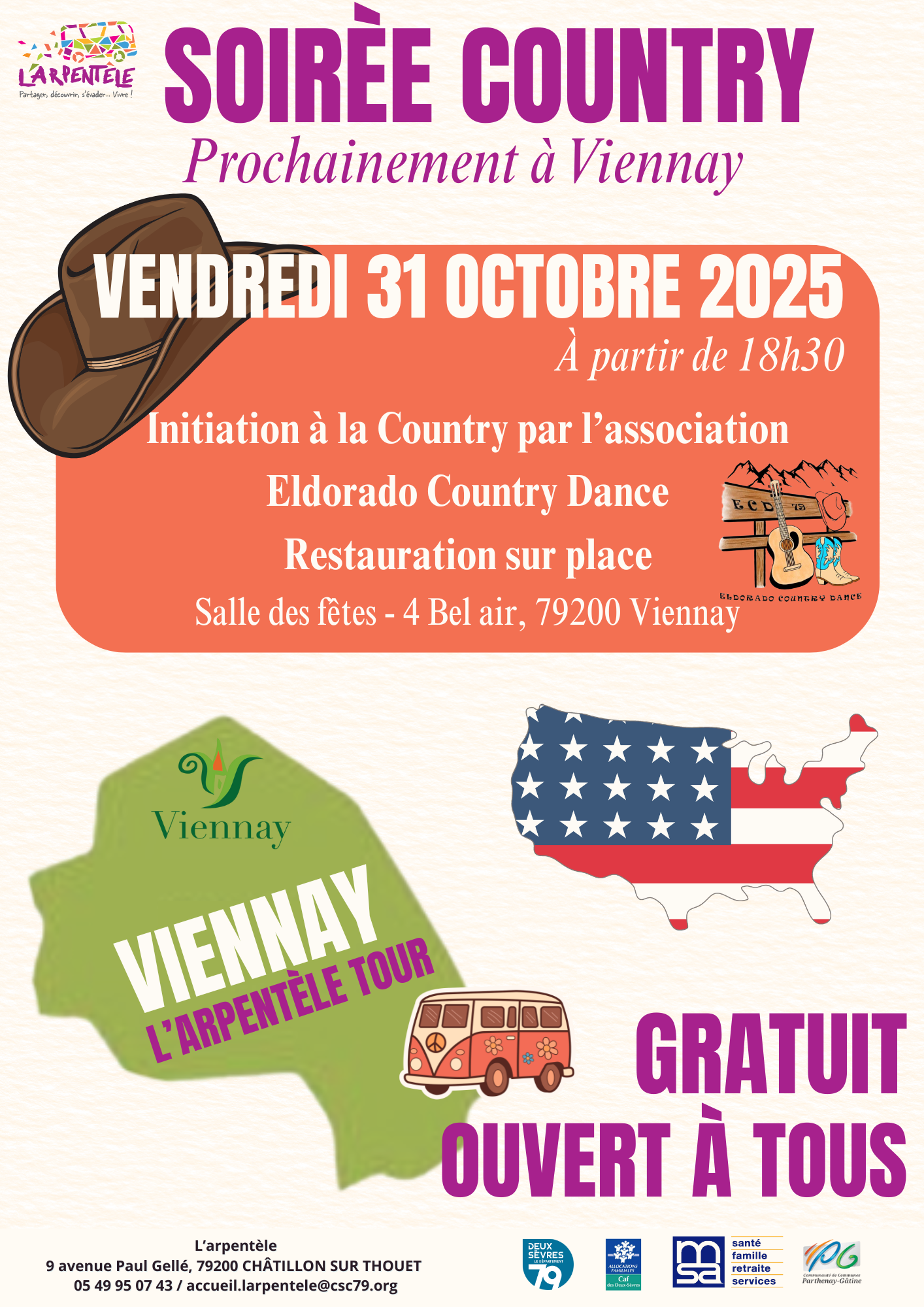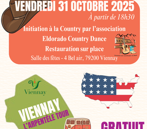 Le31oct.à 18h30 Salle des fêtes de Viennay 4 rue de Bel air 79200 ViennayAjouter à mon calendrier_ Animations Vacances d'automne, LoisirsSoirée countryInitiation à la Country par l'association Eldorado Country Dance.Restauration sur place.Gratuit.Ouvert à tous.Sélection de la vue© OpenStreetMap contributorsFermerPrécédentRetour à la listeSuivant