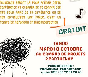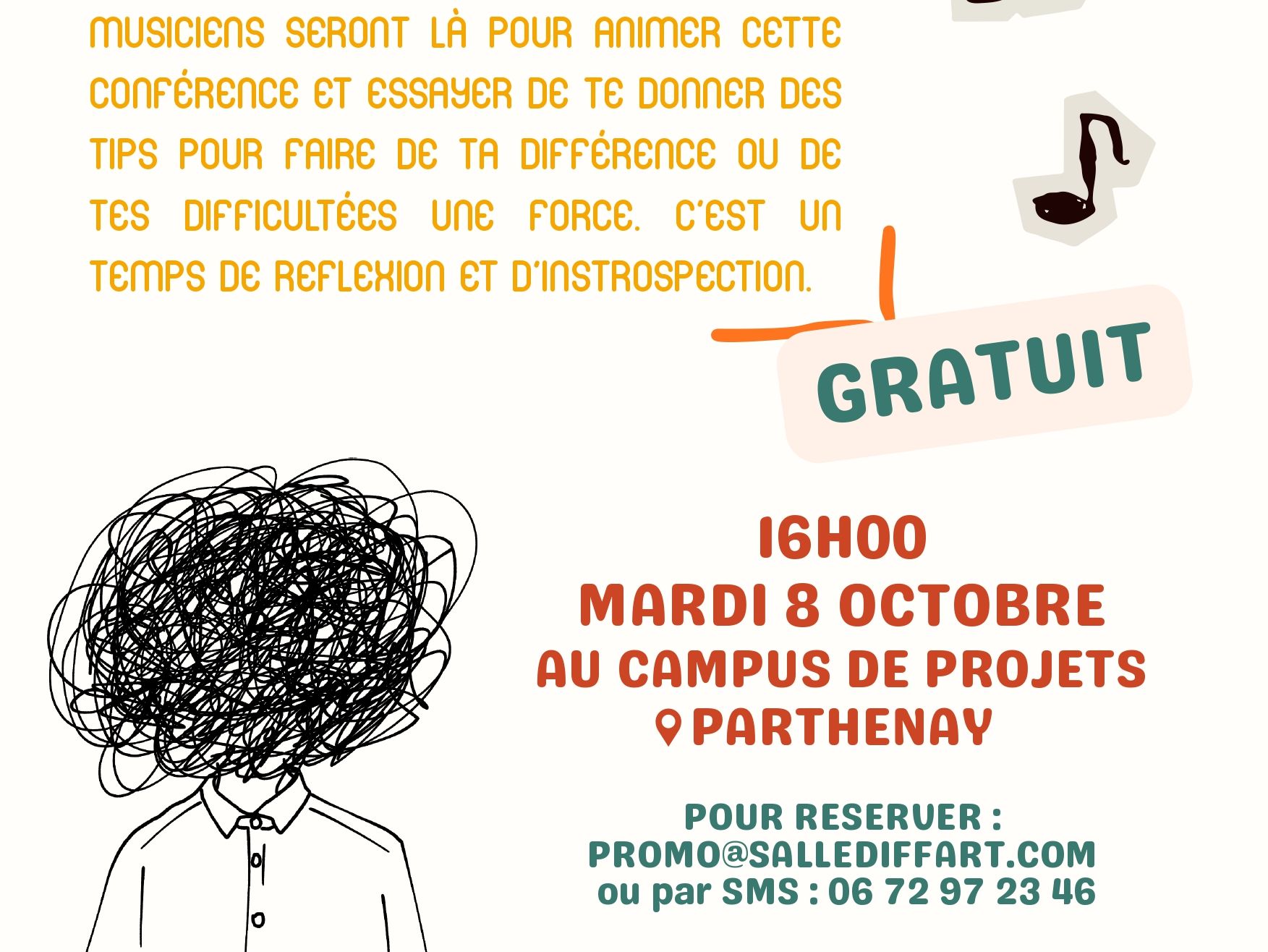 Deux musiciens seront là pour animer cette conférence et essayer de te donner des tips pour faire de ta différence ou de tes difficultées une force.C’est un temps de reflexion et d’instrospection.