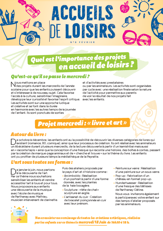 Journal de l'accueil de loisirs - février 2026 Journal de l'accueil de loisirsL'accueil de loisirs de Parthenay-Gâtine publie un journal de ses activités. L'occasion de présenter son projet pédagogique, les idées et activités… Télécharger PDF - 2,8 Mo