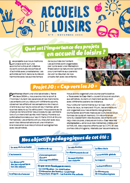 Journal de l'accueil de loisirs - janvier 2025 Journal de l'accueil de loisirsL'accueil de loisirs de Parthenay-Gâtine publie un journal de ses activités. L'occasion de présenter son projet pédagogique, les idées et activités… Télécharger PDF - 3,3 Mo