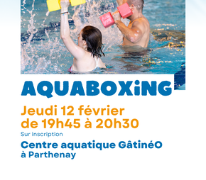 Le12févr.Du 19:45 à 20:30 Centre aquatique GâtinéO Boulevard Georges Clemenceau 79200 ParthenayAjouter à mon calendrier_Animations vacances hiver, SportAquaboxingActivité intensive en musique de 45 minutes, mélangeant cardio et aquaboxe10 euros la séanceSur inscriptionSélection de la vue© OpenStreetMap contributorsFermerPrécédentRetour à la listeSuivant
